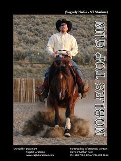 SH SHARLONI is out of TDR SERENADE, also dam of National Champion Reining producer NOBLE DUCHESS by VAGUELY NOBLE. TDR SERENADE is out of SV CONTATA, a full sister to SV CONQUEST, dam of multiple National Champion Half-Arabian Western Pleasure SPOTSDALE. SV CONTATA is a paternal sister to National Champions in western pleasure and country pleasure and a maternal sister to National winner producer MY SULTRESS and National Champion producer SP TATIANA. A successful breeding stallion must come from a strong dam line and NOBLES TOP GUN certainly does!