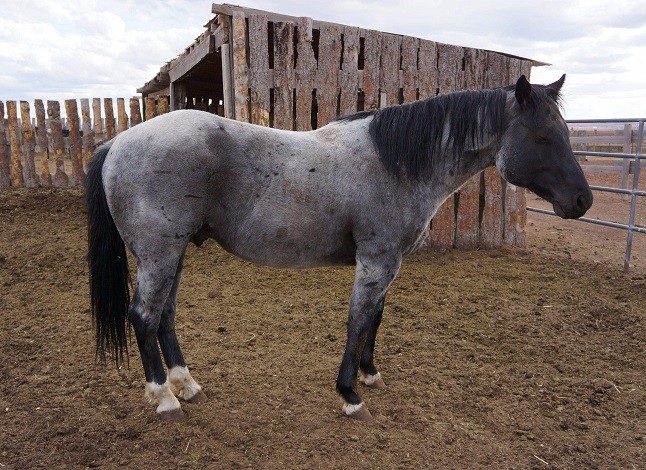 This is for our stallion Whip Hancock. He is color tested, will throw 100% roans with black points so blue/bay/buckskin roans. He came from the Broken Bones up in Wyoming, out of Hancock Blue Boy's full sister. Think he is 14.3. Puts a pretty head, big butt and nice bone on his foals.