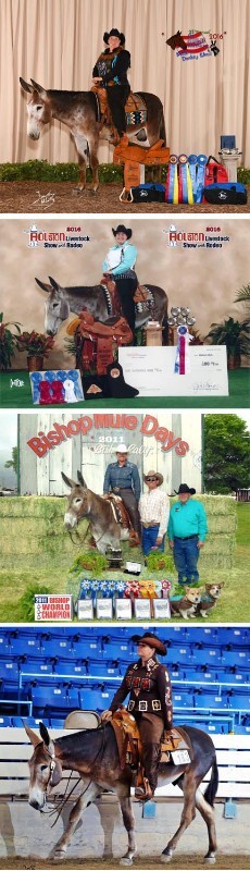 • His oldest offspring were foaled in 2012. They are continuing his winning ways! He has already sired World Champions at Bishop Mule Days, NASMDA National Champions, Pinto World and Congress Champions, Grand and Reserve Halter Champions at nearly every major mule show accross the country as well as performance and high point champions.