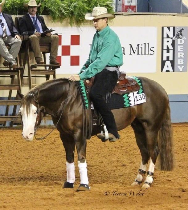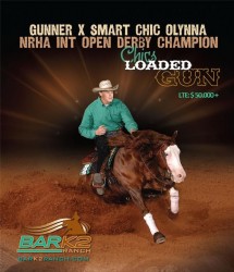 Colonels Smoking Gun (Gunner), a National Reining Horse Association Hall of Fame inductee, was the NRHA Futurity Reserve Champion in 1996, and tied for Reserve at the NRBC in 1998. He also went on to win the USET Reining Championship in 2001. He was immortalized as a Breyer Horse USET Special Edition model, as well. As Tim and Colleen moved Gunner to Tioga, TX after becoming his new owners in 2005, he was already a world champion reining sire. His outstanding offspring include 2009 NRHA Futurity and 2010 Derby Open Champion, Gunnatrashya. Gunner has sired numerous Futurity and Derby finalists and champions, in both the Open and Non Pro divisions, including 2012 NRHA Open Futurity Champion, Americasnextgunmodel, 2012 NRHA Open Futurity Reserve Champion, Gunners Tinseltown, and 2012 NRHA Non Pro Co-Champion, Customized Gunner. Gunner has also sired Gunners Special Nite, winner of the individual Gold medal at the 2010 World Equestrian Games, as well as had three offspring place Top Ten in the 2010 NRHA Futurity Open Finals, including our own Always Gotyer Gunsup (also 2012 NRBC Non Pro Champion and 2013 NRBC Non Pro Reserve Champion).