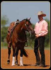 At three, finalist in the 2005 NRHA Open Futurity; 4th, Congress Open Reining Futurity (winner of the 1st Go); finalist in the Tulsa Reining Classic Intermediate Open Futurity. At four, 2006 National Reining Breeders Classic Open Derby Champion; 5th, NRHA Open Derby; 2006 Equi-Stat #1 Leading 4/6-Year-Old Money-Earner and #3 Overall Reining Money-Earner; 2006 Congress Junior Reining Reserve Champion; Lazy E Intermediate Open Derby Champion and Open Co-Champion; 4th, Wimpys Little Step Open Derby. At five, 2007 NRHA Intermediate Open Derby Reserve Champion and top 12, Open; 2007 National Reining Breeders Classic Intermediate Open Derby Champion and National Reining Breeders Classic Open Derby Reserve Champion; 2007 Equi-Stat #1 Reining Money-Earner; Las Vegas Reining Classic Open & Intermediate Open Derbies’ Champion; National Reining Breeders Classic Intermediate Open Prelim Co-Champion and Open Prelim Co-Reserve Champion; Wimpys Little Step Intermediate Open Derby Champion and Open Reserve Champion; Bill Horn Shootout Open Derby Champion; Volunteer Breeders Classic Open Reining Derby Reserve Champion; Penny Less Open Reining Derby Reserve Champion. At six (2008), 2008 Bill Horn Shootout Open Derby Champion. In AQHA events, 4th, 2006 World Championship Junior Reining; Performance ROM, earning 25 open reining points.