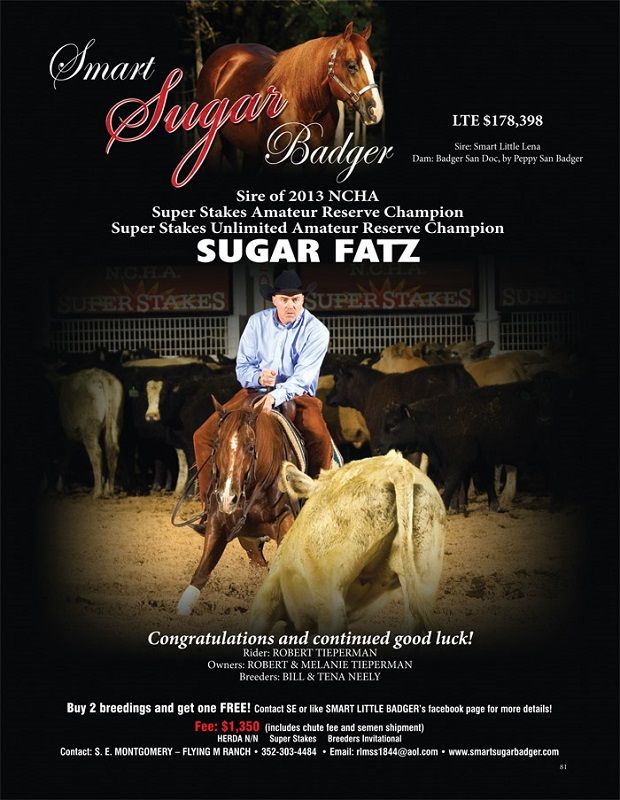 NCHA $162,541 produce NCHA $515,356 BADGER SAN DOC, has LTE of $187,000 and she has produced money earners nearing $1 Million! She has also produced SHEYSSMARTLITTLELENA, LTE $99,540 as well as the producer of REDNECK YACHTCLUB, LTE $525,000 ! BADGER SAN DOC is one of ONLY a few elite mares in the history of the NCHA to have two offspring competing in the same NCHA Open Futurity Finals! In fact, she's produced three NCHA Open Futurity Finalists in two years! His bottom side is one of the top reasons SMART SUGAR BADGER is one of the hottest young sires in the industry! His get have earned over $2 MILLION!
