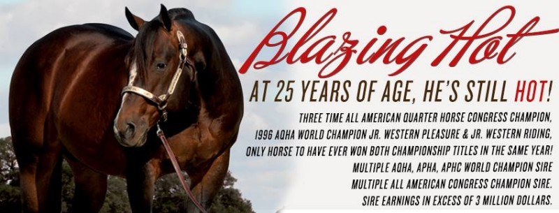 Blazing Hot is the only horse to win an AQHA World Championship in both Jr Western Pleasure and Jr Western Riding in the same year (1996).