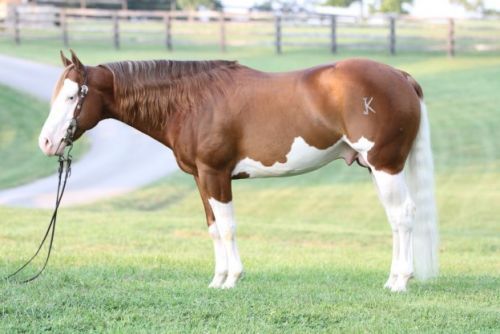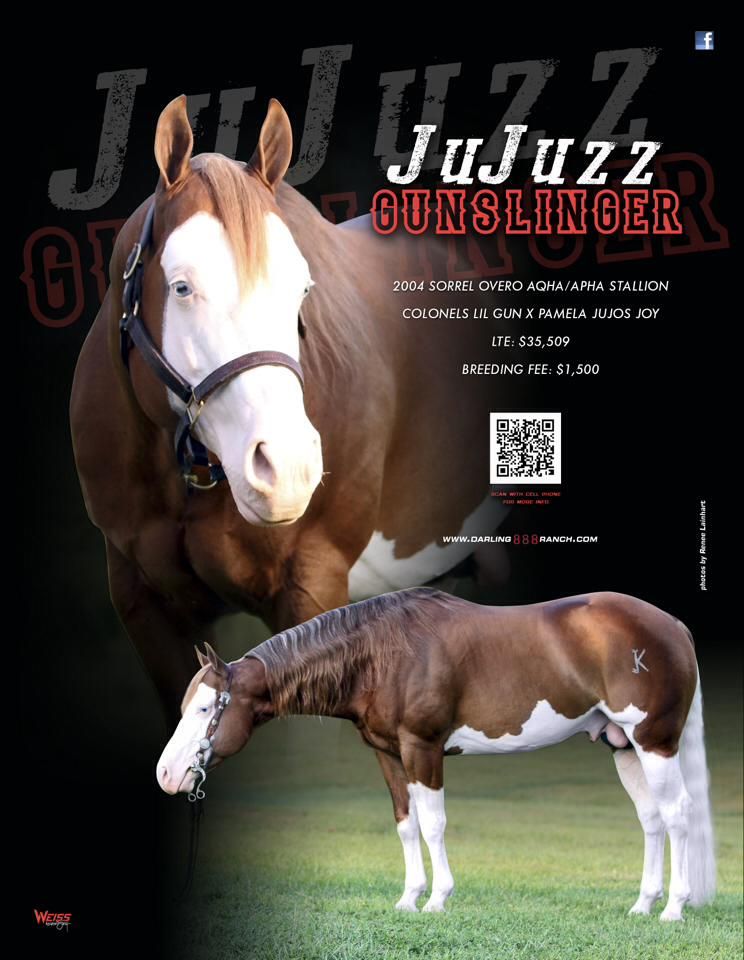 Ju Juzz Gunslinger is a 2001 sorrel overo AQHA/APHA stallion sired by Colonels Lil Gun