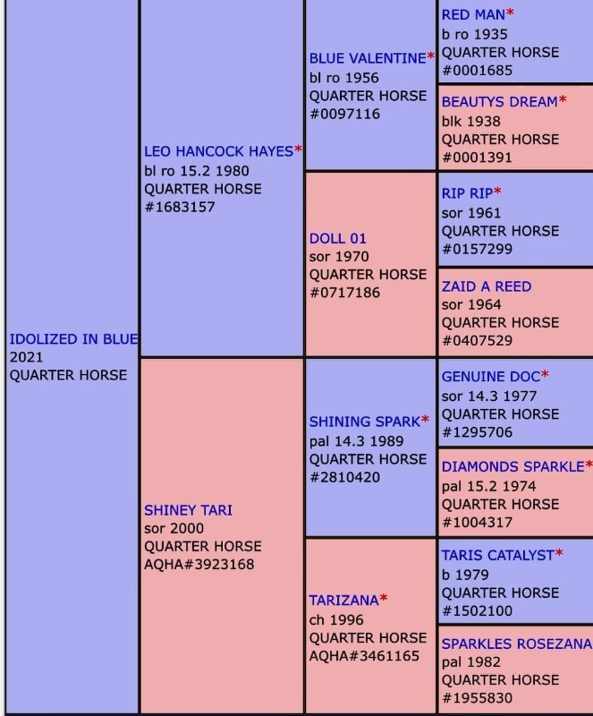 Blue Roan Stallion, own son of Leo Hancock Hayes (x Blue Valentine) out of all time #1 producing cowhorse mare Shiney Tari ($1 million+ producer)