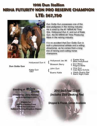 • Hollywood Dun It; LTE of $65,809. NRHA Fut Rsrv Champ; NRHA Derby Champ. NRHA Five Million Dollar Sire and Hall Of Fame Sire. Equ-Stat's 2nd All Time Leading Reining Sire with offspring earnings in excess of $6,700,00 including AQHA Incentive earnings.