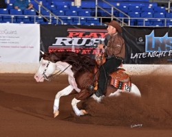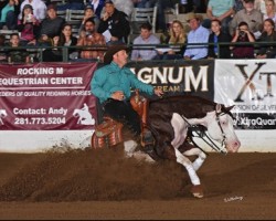 Colonels Smoking Gun (Gunner), a National Reining Horse Association Hall of Fame inductee, was the NRHA Futurity Reserve Champion in 1996, and tied for Reserve at the NRBC in 1998. He also went on to win the USET Reining Championship in 2001. He was immortalized as a Breyer Horse USET Special Edition model, as well. As Tim and Colleen moved Gunner to Tioga, TX after becoming his new owners in 2005, he was already a world champion reining sire. His outstanding offspring include 2009 NRHA Futurity and 2010 Derby Open Champion, Gunnatrashya. Gunner has sired numerous Futurity and Derby finalists and champions, in both the Open and Non Pro divisions, including 2012 NRHA Open Futurity Champion, Americasnextgunmodel, 2012 NRHA Open Futurity Reserve Champion, Gunners Tinseltown, and 2012 NRHA Non Pro Co-Champion, Customized Gunner. Gunner has also sired Gunners Special Nite, winner of the individual Gold medal at the 2010 World Equestrian Games, as well as had three offspring place Top Ten in the 2010 NRHA Futurity Open Finals, including our own Always Gotyer Gunsup (also 2012 NRBC Non Pro Champion and 2013 NRBC Non Pro Reserve Champion).